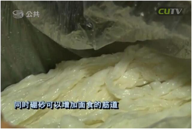 據(jù)了解,硼砂是一種易溶于水的工業(yè)原料,因毒性較高,廣泛用于殺菌殺蟲劑的生產(chǎn)。人體過多食用后,會引起多臟器的蓄積性中毒。同時,硼砂可以增加面食的筋道,因此成為黑心廠商的違法添加物。目前,食品廠法人以及相關(guān)負責人已被刑拘。