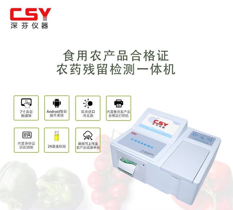 深芬儀器農藥殘留檢測儀全新升級為您的食品安全保駕護航,隨著國家對食品安全問題的監(jiān)管和把控,在農業(yè)種植養(yǎng)殖,農貿市場、超市以及市場監(jiān)管等都有必要配備農藥殘留檢測儀用來檢測果蔬等農產品的農藥殘留情況,以保障綠色食品的健康與安全。在日常生活中,食品安全問題是百姓民生關注的大事,其中最引人關注的就是日常果蔬農產品的農藥殘留問題,若長期服用農藥殘留超標的果蔬,很容易引發(fā)各種疾病,甚至影響人們的身體健康和誘發(fā)癌癥。為了幫助人們快速識別出果蔬當中農藥殘留超標的問題食品。深芬儀器特推出了農殘檢測技術最新研發(fā)成果CSY系列農藥殘留檢測儀。